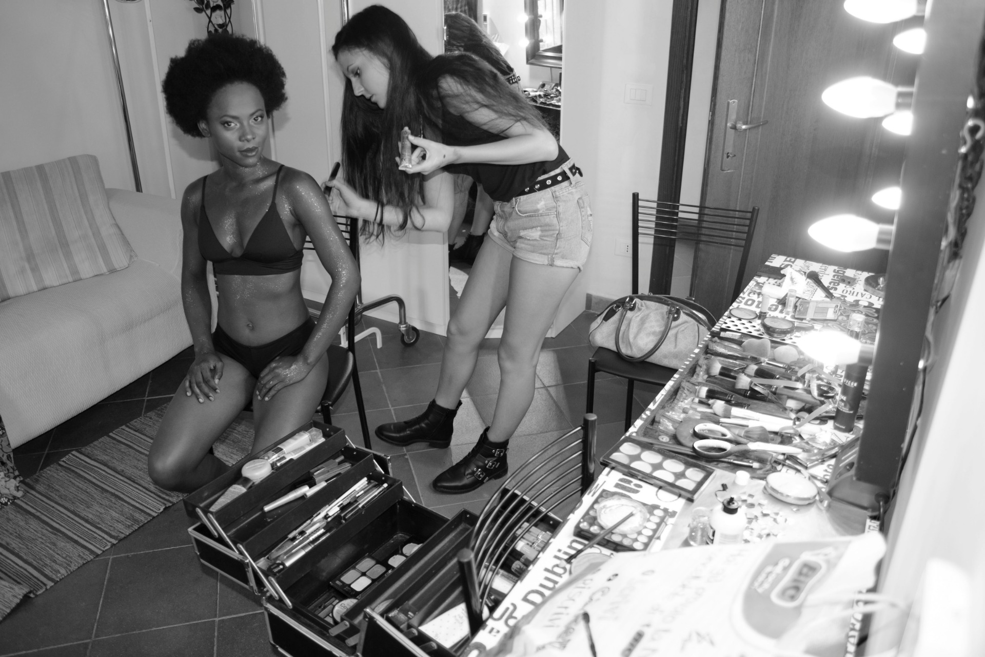 C'è una camerino per trucco e cambio abito con bagno e doccia, una cucina dove è possibile fare pause snack, tè, caffè; l'ambiente è caldo e molto confortevole.